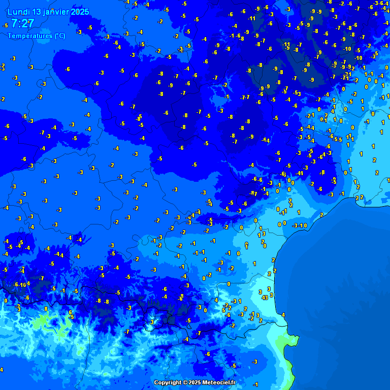 Sans surprise, les conditions météo sont très hivernales ce lundi 13 janvier au petit matin. De fortes gelées sont en cours en Occitanie. Si le vent protège certains secteurs du gel, ce n’est pas dans le cas dans l’Est de l’Hérault. La zone du Pic Saint-Loup est concernée par de très fortes gelées. Le mercure est en ce moment situé entre -8°C et -9°C du côté de Prades-le-Lez ! Un « trou à froid » bien connu de la région. En Lozère, les températures sont similaires et s’approchent des -10°C sur l’Aubrac et la Margeride. Il gèle également à Montpellier, autour des -2°C.