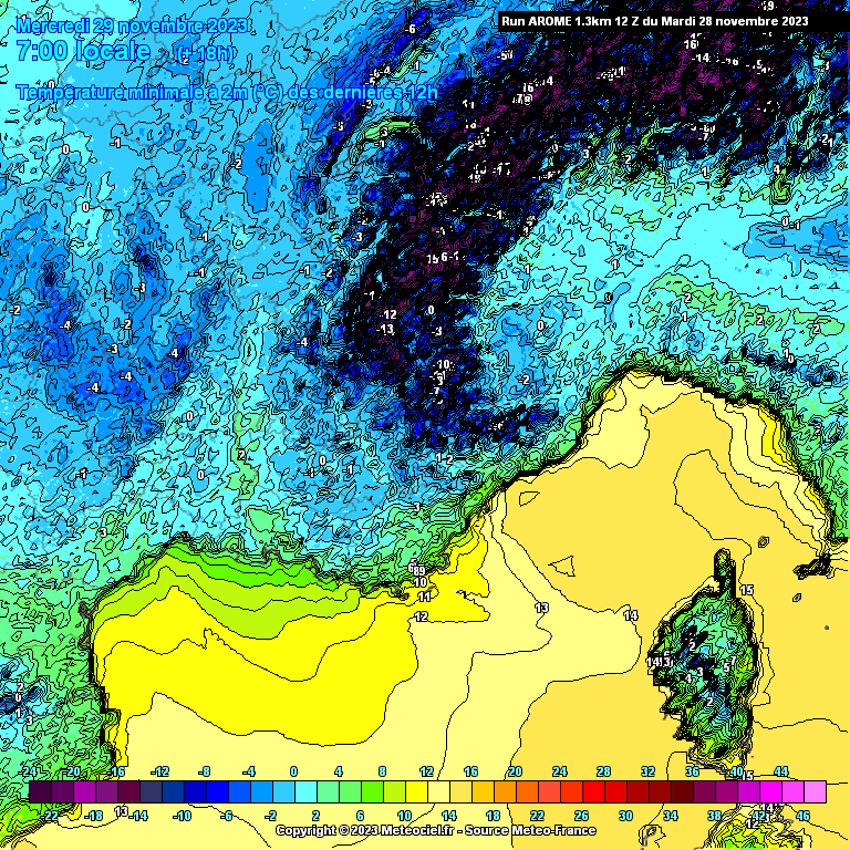 Carte des températures minimales modélisées par AROME pour ce mercredi matin.