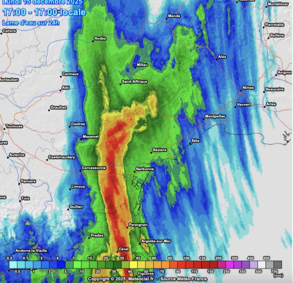 L’épisode pluvieux se poursuit toute la journée de ce mardi 16 décembre. Il touche essentiellement les reliefs pour cette journée, avec peu de pluie en plaine. Les précipitations perdurent jusque dans la nuit de mardi à mercredi sur les reliefs de l’Hérault et du Gard. Les cumuls de pluie d’ici la fin de l’épisode sont importants. De l’ordre de 100 à 150 mm de façon généralisée à l’ensembles des zones de relief. Plus localement, on relèvera autour des 200 mm voire 230 mm entre la Montagne-Noire et l’Espiniouse.