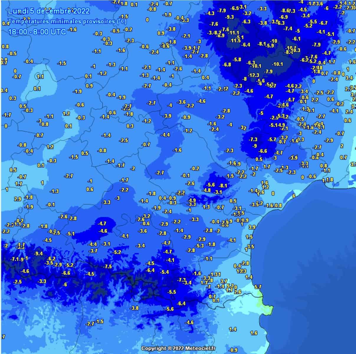 Températures minimales relevées ce lundi 5 décembre 2022 en Occitanie