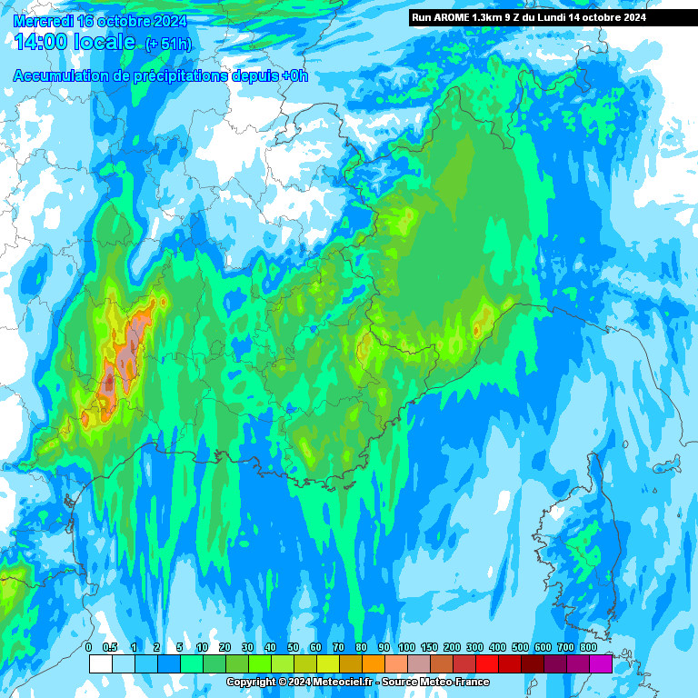 L’épisode cévenol ne fait plus de doute. Celui-ci durera environs 48 heures avec des cumuls de pluie qui deviendront déjà importants localement en Cévennes dès mercredi. Ci-dessous, une modélisation brute par le modèle AROME des cumuls possibles uniquement d’ici mercredi 16 octobre à 14 heures. On peut voir des quantités voisines des 100 à 150 mm, localement déjà 150 à 200 mm près de l’Aigoual. A ce stade, il restera encore au moins 24 à 30h heures d’épisode.