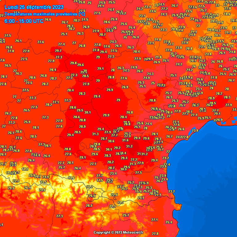 Carte des températures maximales relevés ce lundi 25 septembre 2023 en Occitanie – Météociel