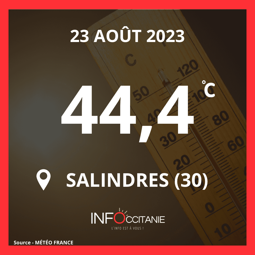 A Salindres dans le bassin Alésien, le record absolu de chaleur a été battu. Il était de 44°C et datait du 1er aout 1947. Désormais, il est de 44,4°C en ce mercredi 23 aout. Il s’agit par ailleurs de la température la plus élevée d’Occitanie et de France relevée aujourd’hui !