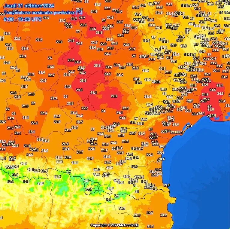 Pour cette journée de vendredi 1er novembre 2024, même menu météo. De la douceur généralisée et parfois même de la chaleur. Côté ciel, il y aura quelques bancs de brumes et brouillards locaux au lever du jour et un soleil radieux en journée. Les températures maximales se situeront entre 21°C et 25°C dans les plaines du Languedoc, du Roussillon et du Midi-Toulousain. Localement, on atteindra encore une fois les 26°C, soit de la chaleur au sens propre du terme en météorologie !