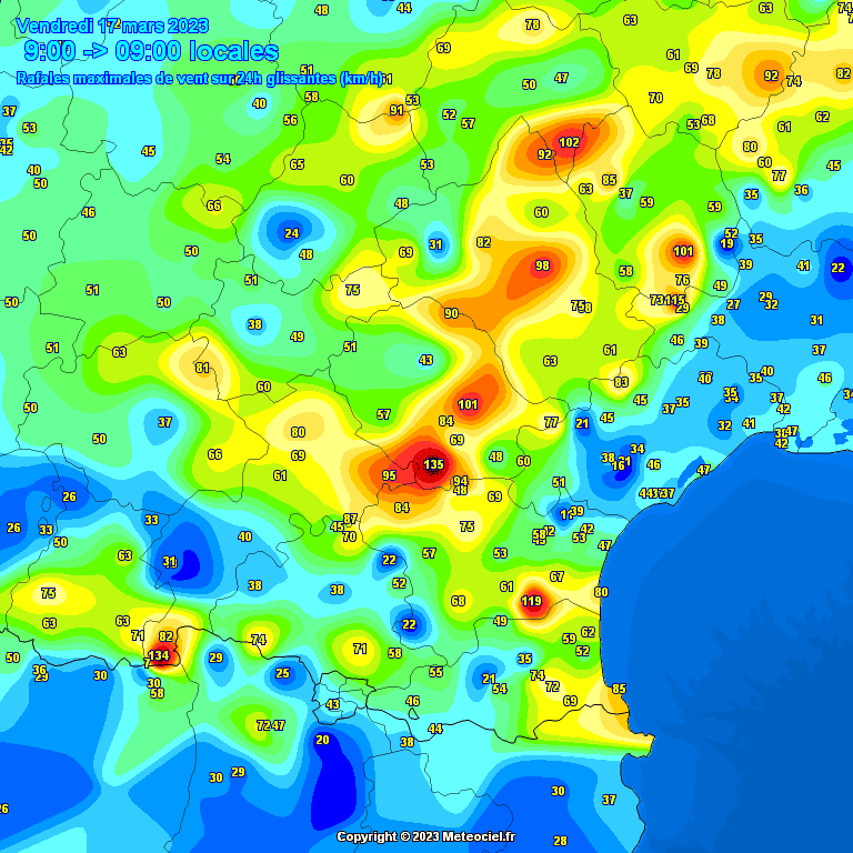Rafales de vent maximales relevées ce vendredi 17 mars 2023 jusqu’à 9h00.