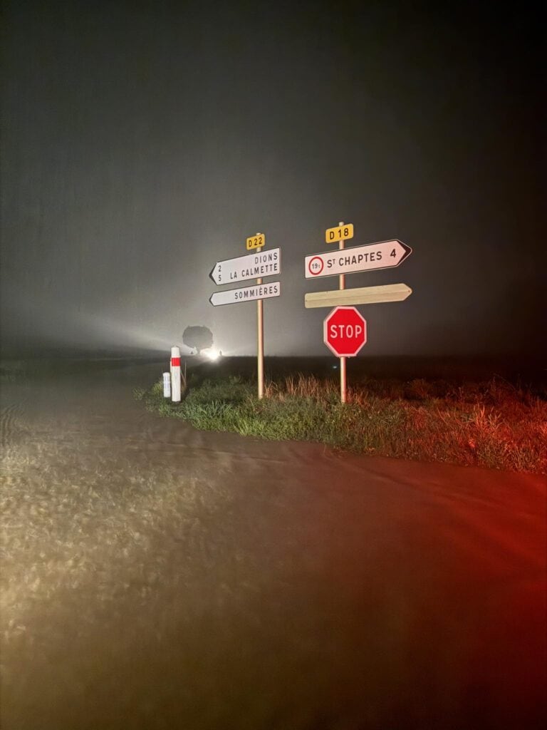 A 1H20, circulation quasi-impossible en Gardonnenque. Routes inondées et dangereuses. Ci-dessous, secteur Moussac / Saint-Chaptes.