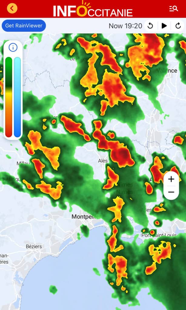 Les orages se généralisent au Nord du Gard notamment vers la vallée de la Cèze. Ils continent aussi de frapper sur l’Est et le Sud du bassin Alésien. Dans le même temps, fortes pluies et orages se développent en vallée du Rhône, dans l’Est du Gard et l’Ouest du Vaucluse. Dans l’Hérault, le temps redevient calme. Ci-dessous l’image radar disponible sur l’application mobile InfOccitanie. L’activité pluvio-orageuse se poursuit jusqu’en début de soirée puis le temps s’améliore nettement et redevient sec la nuit prochaine.