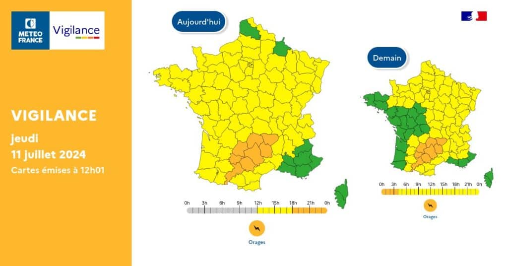 Pas de surprise ! Les services de Météo-France ont placé de nombreux départements d’Occitanie en vigilance orange pour orages violents. Il s’agit de la Lozère, du Tarn du Tarn-et-Garonne, de l’Aveyron, de la Haute-Garonne et du Lot. Tous les autres départements limitrophes sont en vigilance jaune et peuvent aussi connaître des phénomènes forts voire violents.