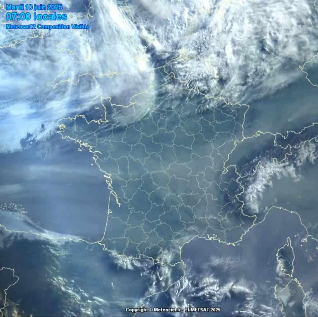 Le phénomène est en place depuis plusieurs jours. Il est parfaitement visible sur les images satellites. Encore plus sur celles du jour, ce mardi 10 juin. Voilà donc pourquoi le ciel est opaque avec une teinte jaunâtre ou orangée du soleil au lever du jour et à la tombée de la nuit. Si les fumées vont progressivement s’évacuer, le ciel ne reviendra pas bleu azur pour autant !