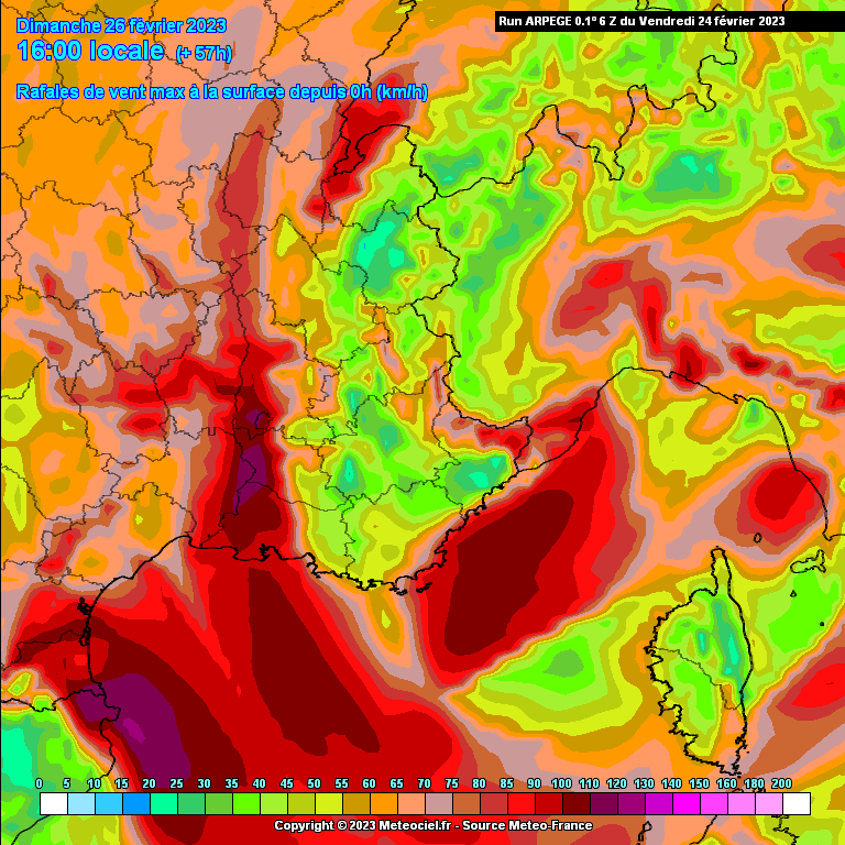 Un fort coup de vent à tempête se produit ce dimanche 26 février 2023 en Méditerranée. Mistral et tramontane vont souffler en tempête. Les rafales atteindront fréquemment de 80 à 100 km/h. Ponctuellement, des rafales allant de 100 à 120 km/h sont probables en vallée du Rhône. Notamment aux confins du Gard, du Vaucluse et des Bouches-du-Rhône.