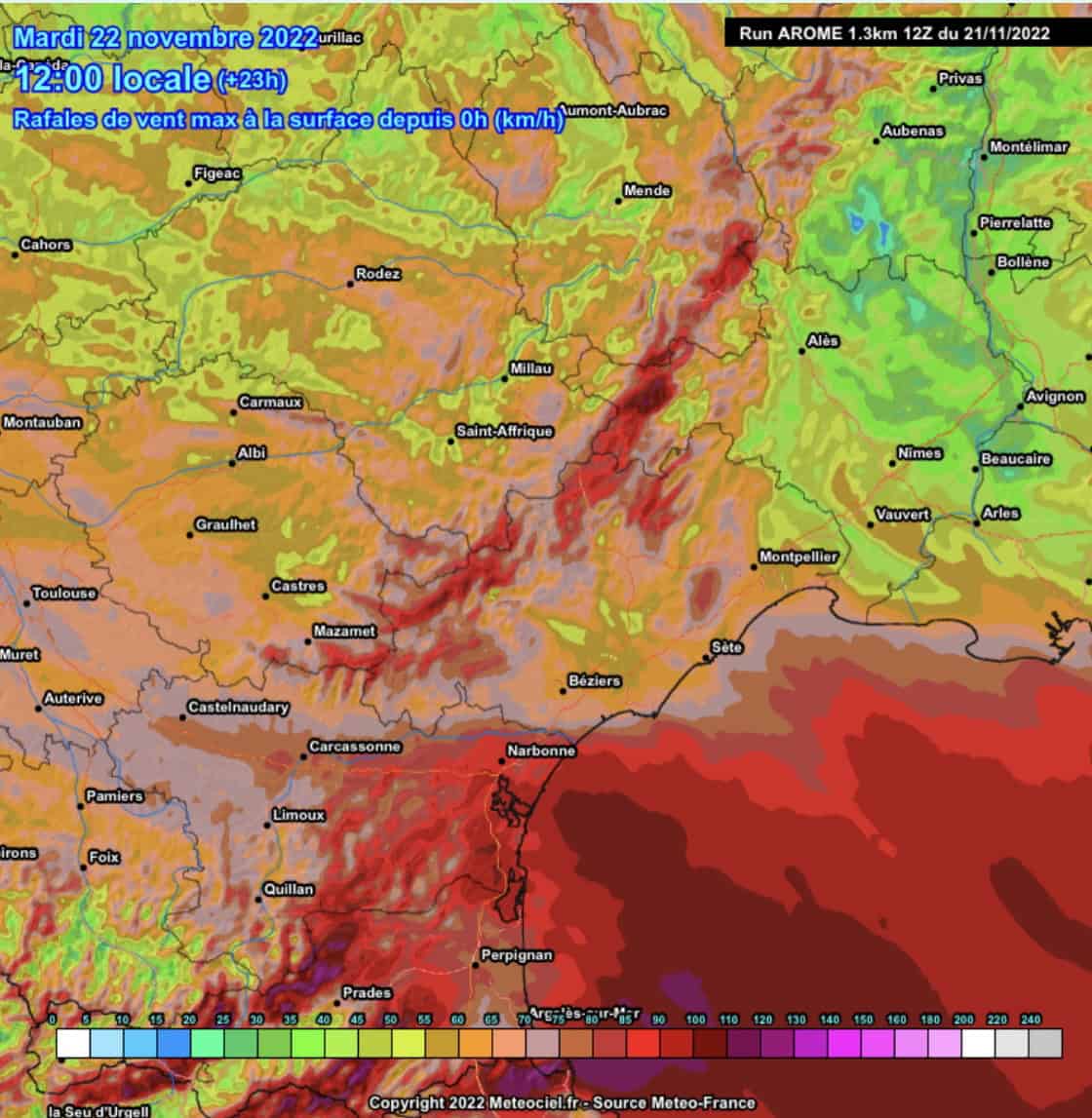 Sur le littoral du Roussillon et dans les Corbières, les rafales atteindront les 100 km/h à 110 km/h, à Narbonne aussi. Dans l’Hérault, le vent atteindra 60 à 70 km/h à Béziers, Sète et Montpellier. A l’Aigoual, plus de 100 km/h en rafales probables. La tramontane atteindra aussi les 80 km/h à 90 km/h sur les hauts cantons héraultais.
