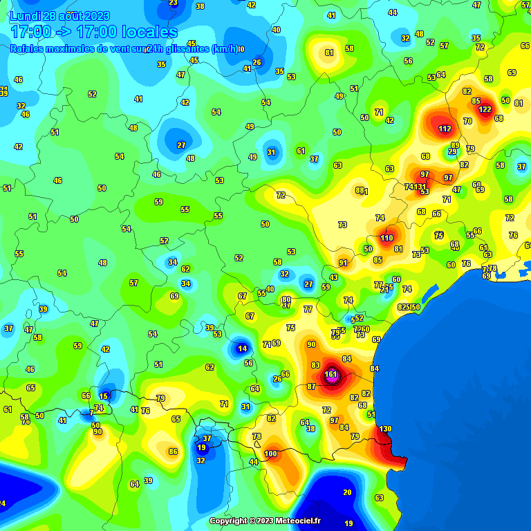 Carte des rafales de vent maximales relevées jusqu’à 17h ce lundi 28 août en Occitanie