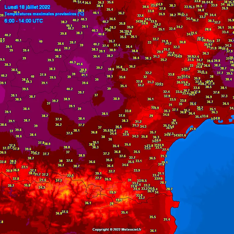 Ce lundi 18 juillet, les températures sont bien souvent identiques à la veille, avec par exemple 33°C à 34°C du côté de Montpellier et de Béziers, 32°C à Sète, 37°C à Nîmes. Par contre, dans le Nord-Est du Gard, le thermomètre a atteint jusqu’à 39°C voire 40°C localement.