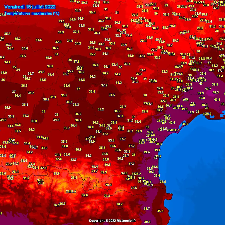 Températures maximales relevées par les stations météorologiques le vendredi 15 juillet – Carte Meteociel