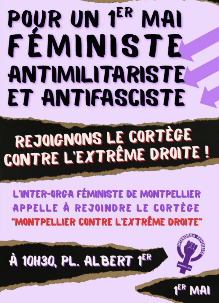 À Montpellier (Hérault), la journée débutera par une manifestation réunissant notamment l’Union syndicale Solidaires 34, le collectif Montpellier contre l’extrême droite et l’inter-orga féministe, engagée pour « un 1er mai féministe, antimilitariste et antifasciste ». Les organisations mobilisées avancent une série de revendications : « Contre les guerres coloniales et les rhétoriques guerrières, contre les menaces fascistes qui s’attaquent aux démocraties, à nos libertés et à nos vies, contre l’exploitation des travailleuses », mais aussi « pour une paix juste et durable entre les peuples » et « pour un monde féministe, égalitaire et solidaire ». Le cortège s’élancera à 10h30 depuis la place Albert 1er.