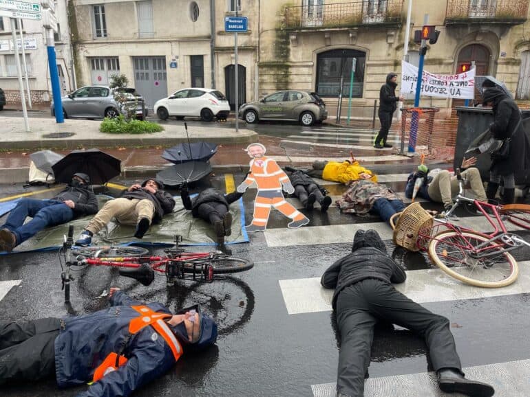« Nous avons référencés près de 70 accidents en 2 ans et demi, et il y en sûrement plus », estime Corinne, membre du collectif des riverains des 4 Boulevards, présente ce samedi sur le Boulevard Rabelais. L’objectif de ce « die-in » est simple : interpeller Michaël Delafosse, ainsi que Julie Frêche, afin faire part des nombreuses nuisances qui impactent le quotidien des habitants. De plus, ce die-in sert à dénoncer le côté « accidentogène des boulevards ». « Le jour où il y aura un mort, ils ne pourront pas dire qu’ils n’étaient pas prévenus ».