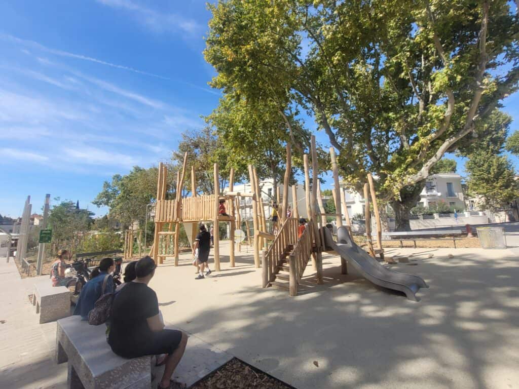 Le narratif est tout autre du côté de Coralie Mantion. L’élue d’opposition écologiste au sein du mouvement Le Printemps montpelliérain, porté par le candidat aux municipales Jean-Louis Roumegas, ne voit pas ce nouvel espace du même oeil. « L’aménagement réalisé demeure insuffisant face aux défis climatiques. Seuls 25 % de la place ont été végétalisés, le reste étant encore largement minéral. Cela ne permet ni d’absorber efficacement l’eau lors des fortes pluies, ni de créer un véritable îlot de fraîcheur », pointe-telle, tout en reconnaissant toutefois : « Transformer un parking en espace public constitue une avancée positive pour le quartier des Arceaux : cela apaise le cadre de vie et favorise le lien social, les rencontres entre habitants ».