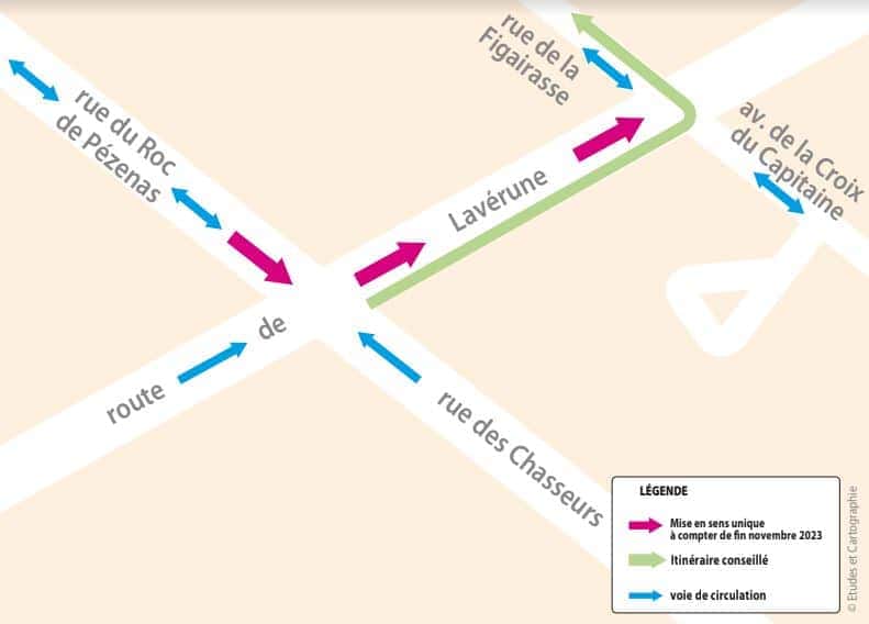 Dans le secteur Chamberte / Les Roses, des ajustements similaires seront effectués, comprenant la fermeture de l’accès à la rue du Roc de Pézenas et la mise en sens unique de la route de Lavérune en direction du centre-ville, entre la rue des Chasseurs et l’avenue de la Croix du Capitaine.
