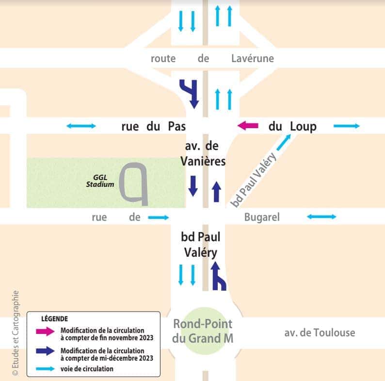 C’est pourquoi, la rue du Pas du Loup sera partiellement mise en sens unique, tandis que l’avenue de Vanières sera réduite à une voie dans chaque sens de circulation entre le rond-point du Grand M et la route de Lavérune.