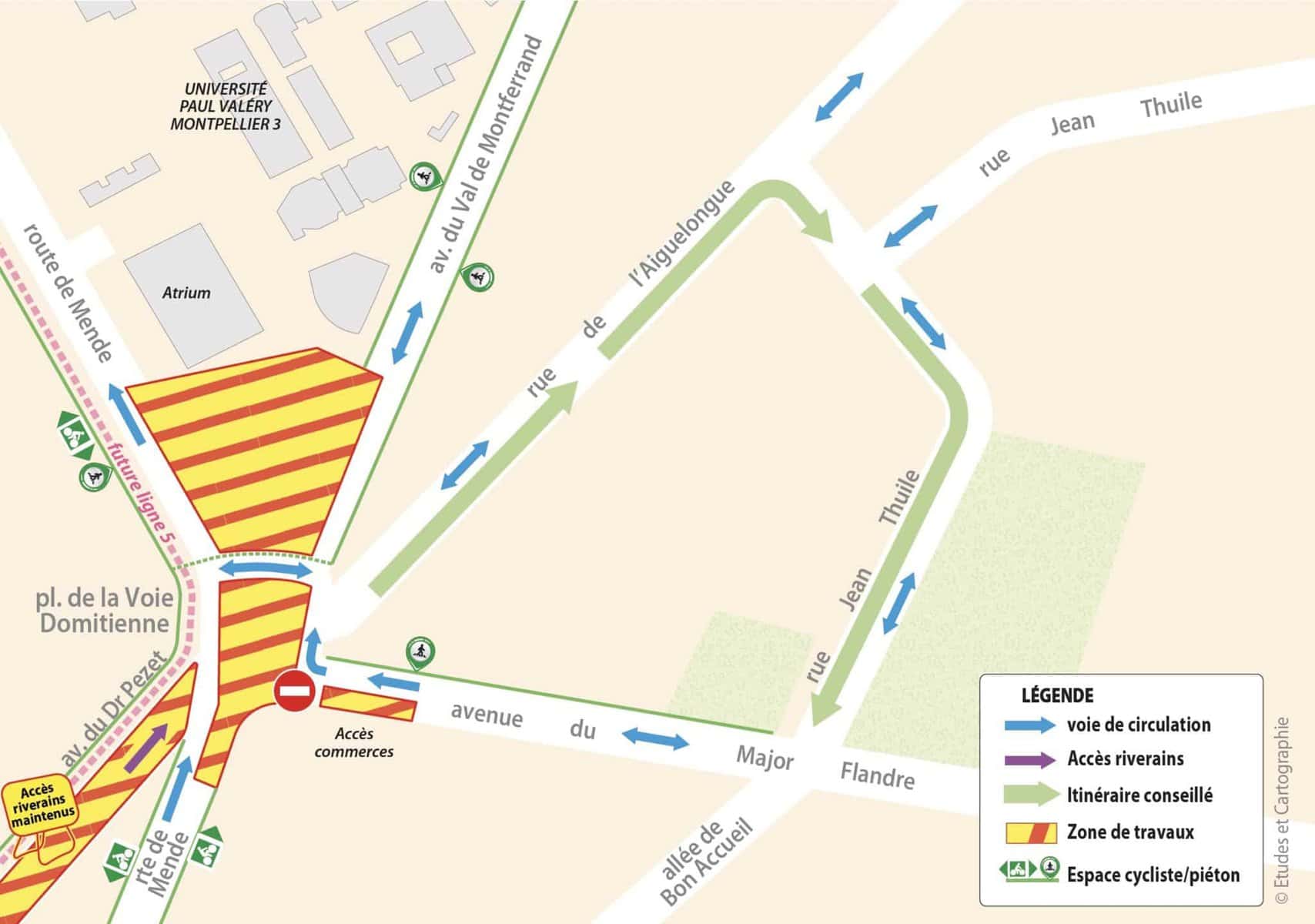 Ainsi, du 20 novembre 2023 au 8 janvier 2024, l’accès à l’avenue du Major Flandre depuis le carrefour de la place de la Voie Domitienne, sera fermé à la circulation. Par conséquent, une déviation sera mise en place par les rues de l’Aiguelongue et Jean Thuile. Des accès aux commerces proches de la zone de chantier seront aménagés pendant cette période.