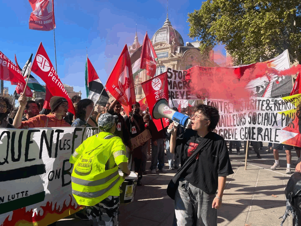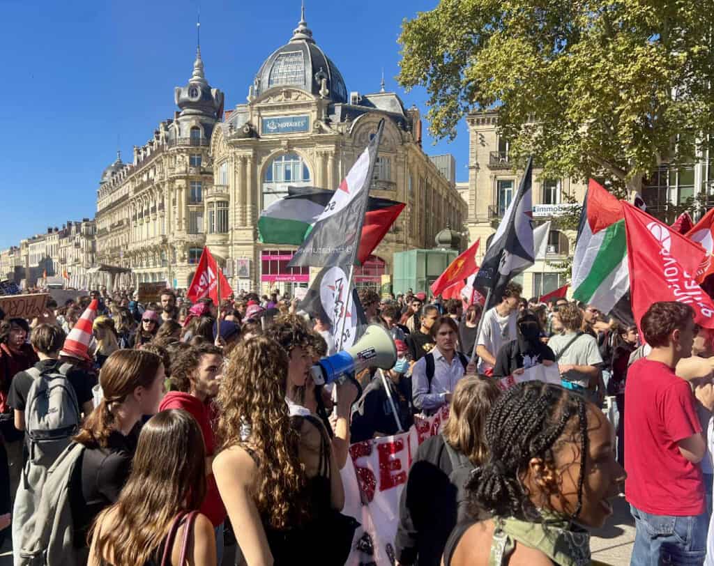 Au sein de la manifestation, des jeunes antiracistes et antifascistes affichent leurs idéaux politiques avec entrain. Des tensions se manifestent avec quelques syndicats FO : « vous n’avez pas de pouvoir décisionnaire sur l’ordre de la manifestation, nous avons aussi le droit de manifester », réplique une jeune femme en rappelant la décision du tribunal administratif. Les jeunes en question hurlent en coeur : « Nous sommes tous Gaza » ; « Siamo Tutti Antifascisti », ou bien : « tout le monde déteste la police ». Dans l’air volent des drapeaux de la Palestine, de Révolution permanente ou du Nouveau parti anticapitaliste (NPA). Un logo du SCUM, Syndicat de Combat Universitaire à Montpellier, apparait sur des pancartes. D’autres écriteaux sont pour le moins évocateurs : « Lecornu, dans ton cul » ; « Macron démission », « taxer les riches », ou « Nique Parcoursup, on va vendre des stups ! ». Vidéos à découvrir ci-dessous :