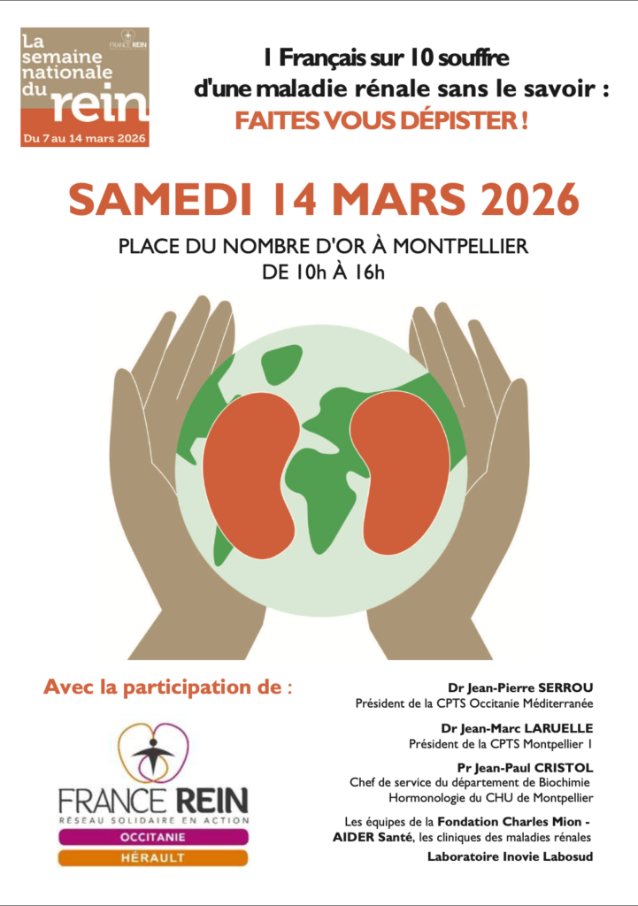 La maladie rénale reste une urgence silencieuse. En France, une personne sur dix en est atteinte sans le savoir. Chaque année, plus de 10 000 personnes découvrent trop tard une insuffisance rénale terminale nécessitant une dialyse immédiate. Pour sensibiliser le public et favoriser le dépistage précoce, France REIN Occitanie Hérault, en partenariat avec de nombreux acteurs publics et privés, organise cette journée de prévention à Montpellier. Ce dépistage organisé ce 14 mars à Montpellier repose en effet sur la mobilisation conjointe de France REIN Occitanie Hérault, du professeur Jean-Paul Cristol, de la CTPS Méditerranée Occitanie, de la CTPS Montpellier 1, des équipes de la Fondation Charles Mion – AIDER Santé, ainsi que des laboratoires Inovie Labosud.