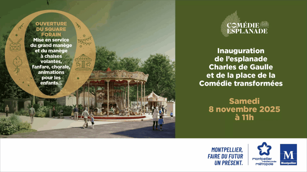 Ce samedi 8 novembre 2025, dès 11h, la mairie de Montpellier invite à « redécouvrir » l’Esplanade Charles de Gaulle et la Place de la Comédie « transformées ». La collectivité indique sur ses réseaux sociaux : « A cette occasion, venez profiter de l’ouverture du square forain : mise en service du grand manège de la Comédie et du tout nouveau manège à chaises volantes. Au programme : fanfare, chorales, animations pour les enfants, gourmandises pour tous et autres surprises… ». En savoir plus, cliquez ici.