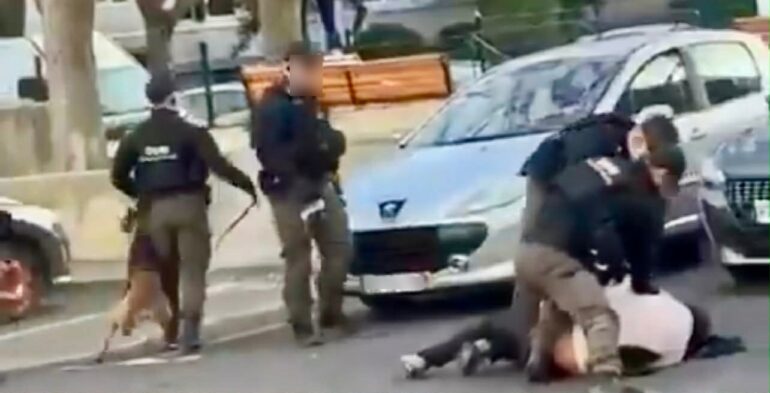 Dans cette vidéo, on aperçoit des agents positionnés aux abords d’une résidence sociale du quartier montpelliérain Aiguelongue. Ils maîtrisent une personne au sol, tandis que d’autres sont affairés à interpeller un autre individu, également fermement maintenu au sol. Certains agents ont le bas du visage dissimulé et portent un gilet pare-balles. Un membre de la brigade est par ailleurs accompagné d’un chien. Une personne, qui se présente comme un habitant, tente de filmer la scène, avant qu’un agent se place devant lui et lui demande de rentrer chez lui. Vidéo à retrouver ci-dessous :