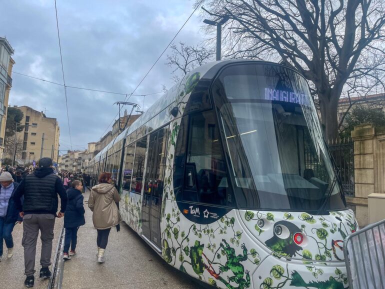 La ligne 5 est sur les rails. Ce samedi les habitants de Montpellier et de sa métropole ont pu profiter d’une nouvelle ligne de tramway flambant neuve reliant Clapiers à Grès. Cette dernière, bien qu’en service depuis 4h du matin, a été officiellement inaugurée à 11h au parc Georges Clémenceau en présence notamment de Michaël Delafosse, maire de Montpellier, de Barthélémy Toguo, artiste camerounais qui a réalisé le design de la ligne 5 et de nombreux autres élus.