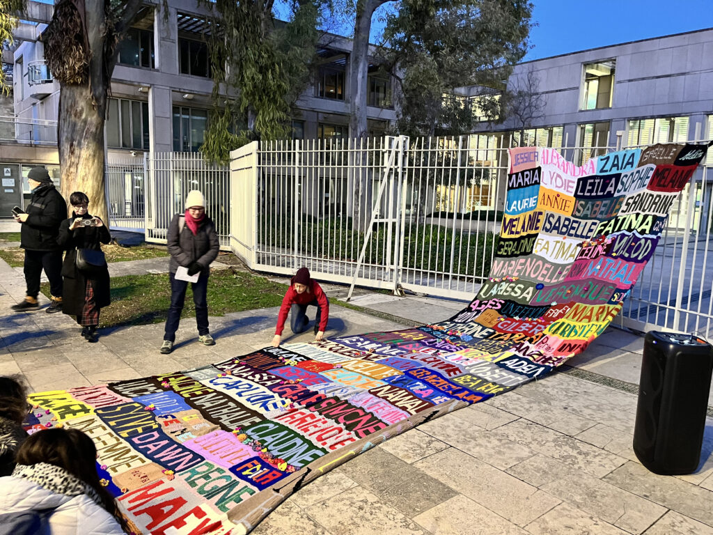 98 prénoms. Depuis un an, Les Tricoteuses Hystériques tricotent le prénom de ces 98 femmes tuées par leurs conjoints en 2025. Ce soir, elles nous ont dévoilé leur oeuvre qui fera le tour de France, dans des festivals, des mairies et d’autres évènements. « 98 femmes et des milliers, qui n’ont pas été protégées par notre société qui échoue dans sa lutte contre les violences conjugales. Nous honorons leur mémoire et nous ne les oublions pas », écrivent-elles sur leurs réseaux sociaux.