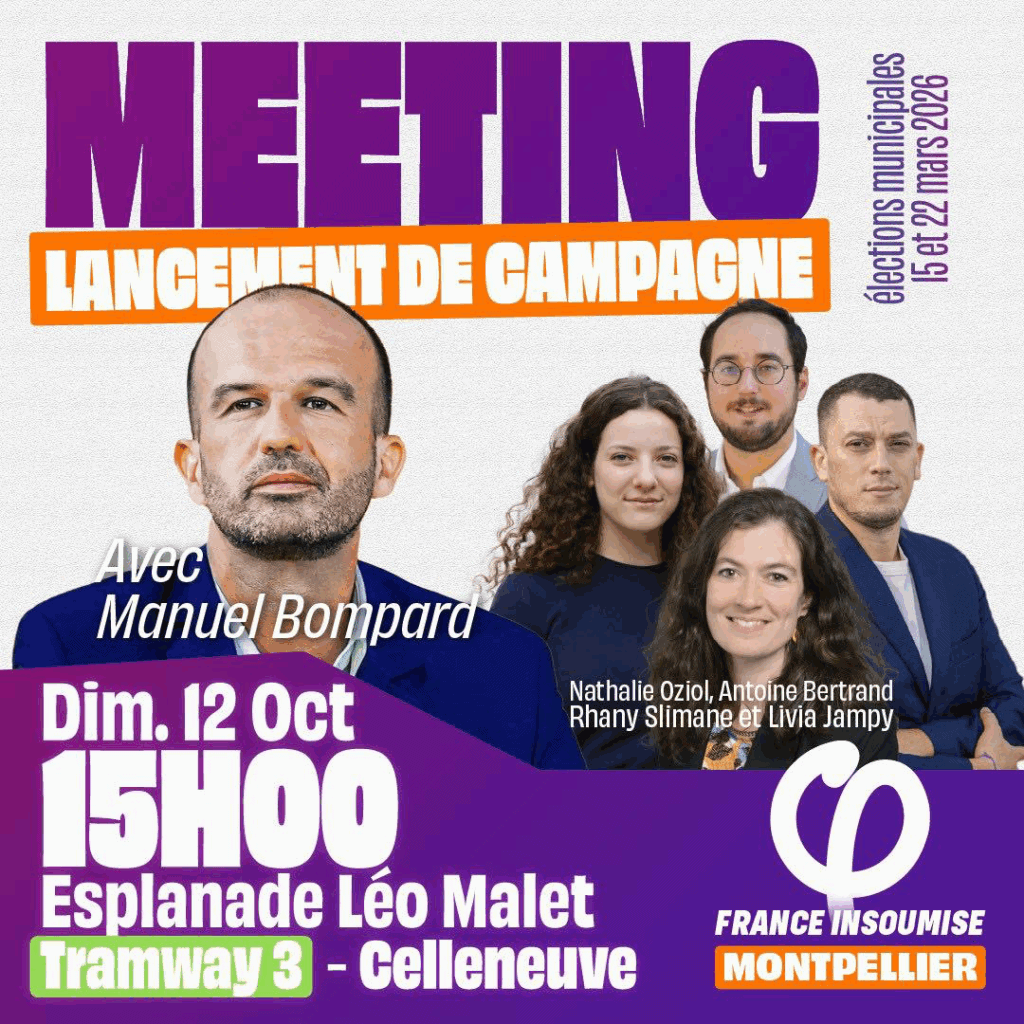 Le premier meeting LFI de la campagne municipale LFI à Montpellier se tiendra le Dimanche 12 octobre prochain, à 15h, esplanade Leo Mallet, quartier Celleneuve. « Nous aurons l’honneur d’accueillir Manuel Bompard (Coordinateur LFI, ndlr). Un grand rendez-vous pour changer la vie des habitants ! Venez nombreux », appelle de ses voeux Antoine Bertrand, co-chef de file LFI pour les municipales à Montpellier. Par ailleurs, la députée de la 2e circonscription de l’Hérault, Nathalie Oziol, a officiellement été désignée tête de liste LFI pour les municipales à Montpellier, un choix officialisé mardi soir à Malbosc, lors d’une assemblée générale municipale des militants, révèle Midi Libre.
