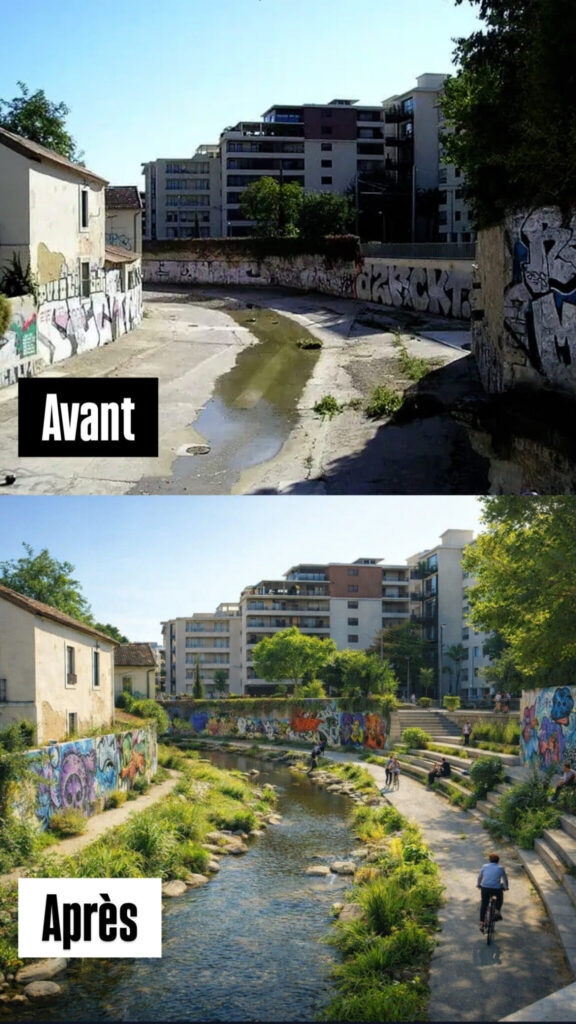 Rémi Gaillard souhaite inverser la tendance. Dans cet article publié sur son site internet ICI, il propose de transformer « ce canal oublié en parc inondable et musée à ciel couvert« . Concrètement, le projet consisterait à re-végétaliser le cours d’eau, remplacer le béton par de la terre et de la verdure, en créant des paliers inondables. Ce qui permettrait, de toute évidence, d’améliorer l’écoulement de l’eau et réduire le risque de débordements et d’inondations.