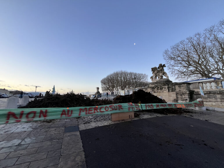 Plusieurs banderoles sont visibles autour des barrages, dont l’une portant l’inscription « Non au Mercosur ». Cette mobilisation intervient le jour du vote du traité de libre-échange avec les pays du Mercosur, une échéance à laquelle les agriculteurs ont tenu à faire entendre leur voix.
