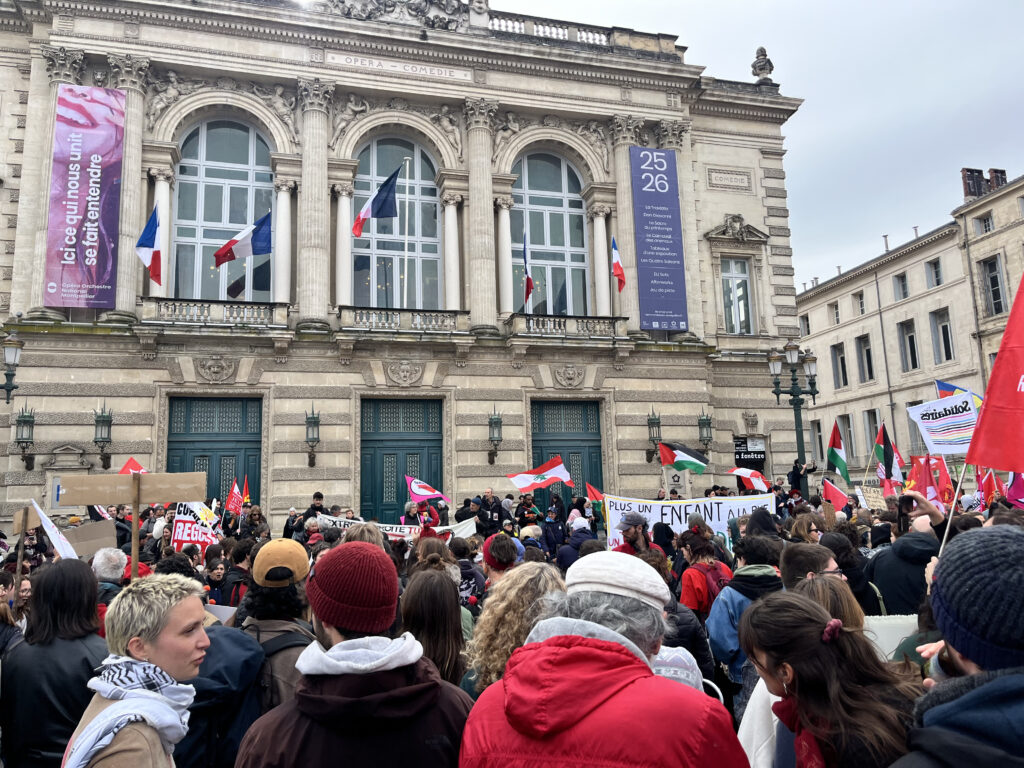 Plusieurs centaines de personnes se sont rassemblées ce samedi après-midi sur la place de la Comédie pour manifester contre le racisme, le fascisme et les violences d’État. Dans le cortège, de nombreuses organisations, collectifs et syndicats ont répondu à l’appel. Les manifestants brandissent pancartes et banderoles pour porter leurs revendications.