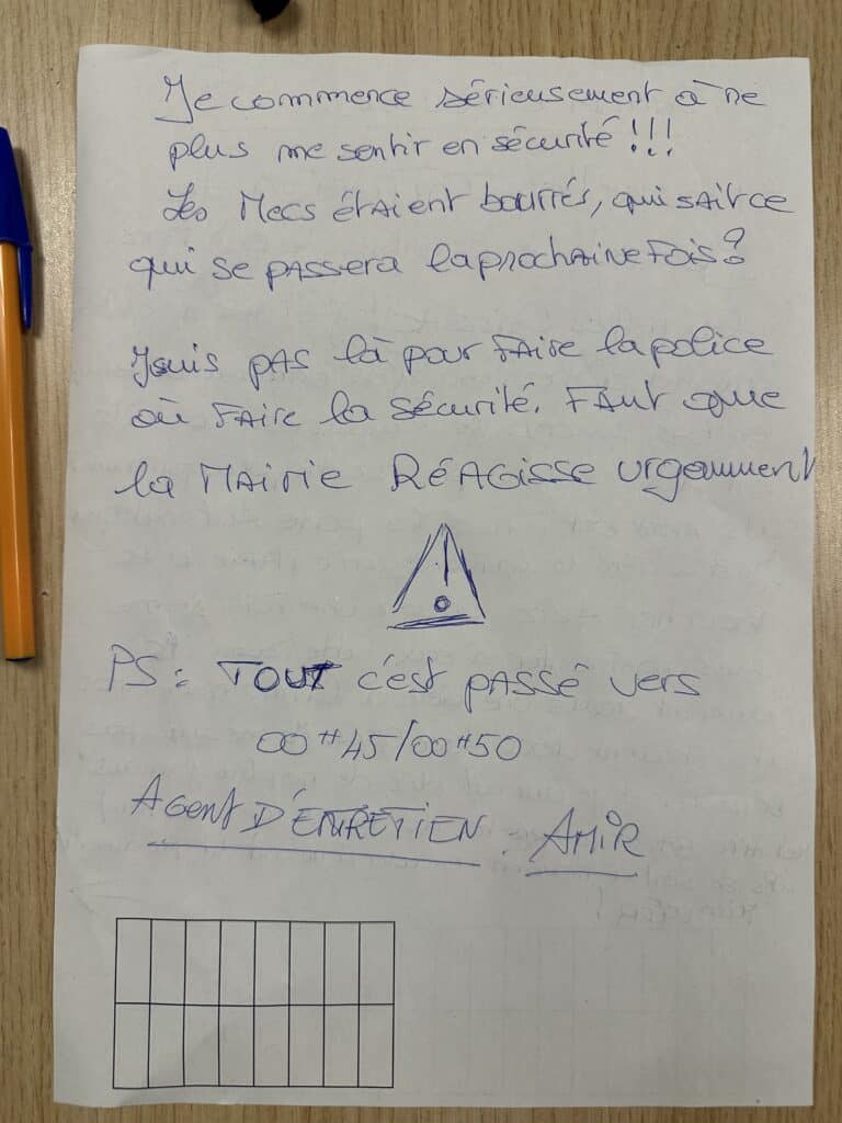 Il fait son service avec la peur au ventre, craignant d’être agressé ». Samedi soir encore, des individus alcoolisés sont entrés par une porte cassée, narrent les commerçants. L’agent a réussi à les faire sortir sans incident grave. Il a d’ailleurs laissé une lettre sur le bureau pour la mairie, « pour crier son désarroi et alerter la mairie dans l’espoir d’obtenir enfin une réaction » (photos ci-jointe).