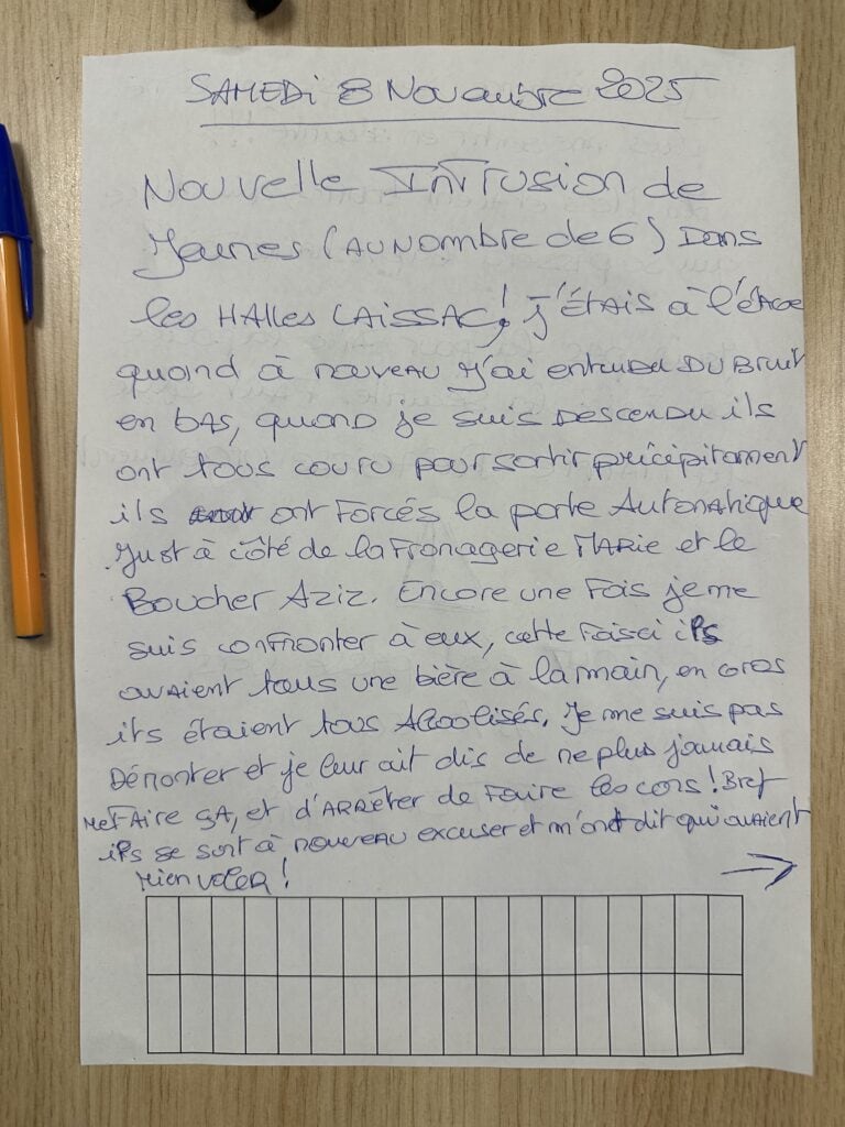 « Cet agent est présent depuis l’ouverture en 2018. Aujourd’hui, il vient chaque nuit avec la crainte de tomber sur quelqu’un d’hostile à l’intérieur des Halles. La période de Noël arrive, le froid aussi : les intrusions vont augmenter, tout comme les risques de dégradations, de vols et de violences. Nous en avons déjà eu l’exemple avec des rideaux découpés au cutter », poursuivent les commerçants des halles.