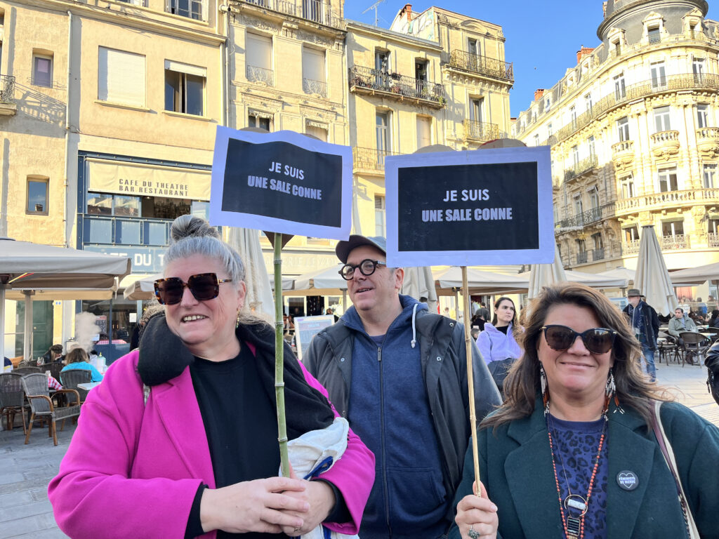 Sur la place de la Comédie, une quinzaine de militantes se sont rassemblées à 14h30 pour faire entendre leur voix. Chacune portait un t-shirt mentionnant les lettres qui, côte à côte, forment les deux mots prononcés par Brigitte Macron : « Sales connes ». Au rythme de la chanson Hymne des femmes, l’une des militantes a dressé une liste de personnalités féminines ayant marqué l’histoire et la société française.