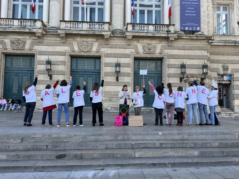 Sur la place de la Comédie, une quinzaine de militantes se sont rassemblées à 14h30 pour faire entendre leur voix. Chacune portait un t-shirt mentionnant les lettres qui, côte à côte, forment les deux mots prononcés par Brigitte Macron : « Sales connes ». Au rythme de la chanson Hymne des femmes, l’une des militantes a dressé une liste de personnalités féminines ayant marqué l’histoire et la société française.