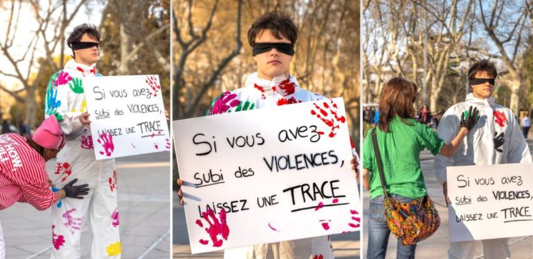 « Si vous avez subi des violences, laissez une trace. » Un message que les passants ont pu lire sur la pancarte de Guillaume, vêtu d’une combinaison blanche, immobile et les yeux bandés, sur la place de la Comédie. À ses pieds, plusieurs récipients de peinture étaient disposés afin que les victimes puissent « laisser une trace ».