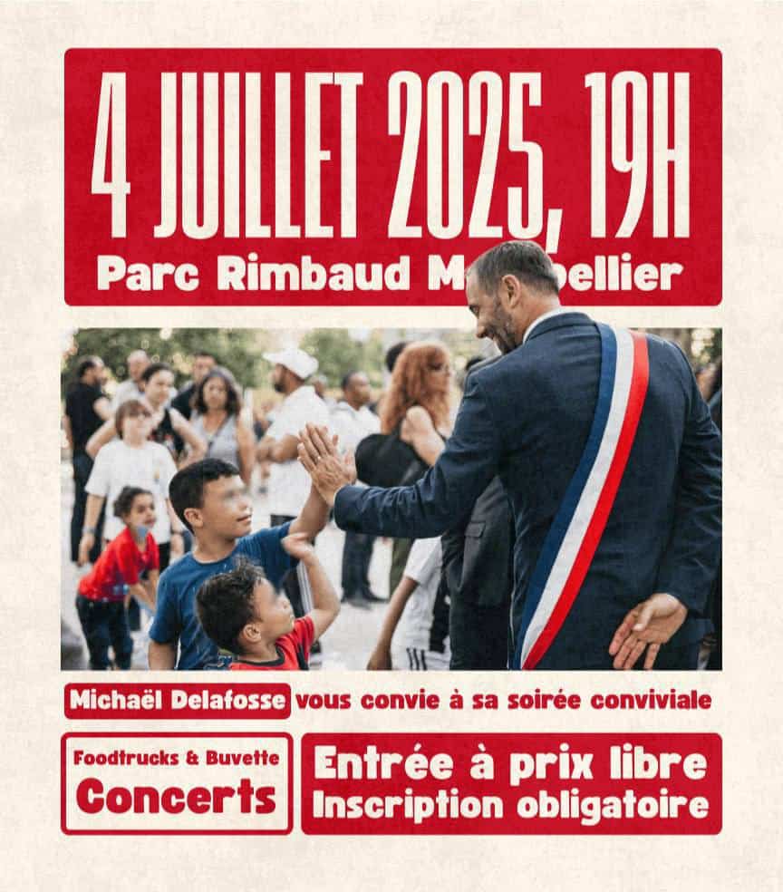 « Retrouvons-nous en toute convivialité ! », s’enthousiasme Clare Hart, vice-présidente de la Métropole, en charge du rayonnement international et européen. Le flyer partagé par l’élue sur X fait apparaître le maire/président de Montpellier, Michaël Delafosse, écharpe tricolore sur le dos, avec pour inscription : « Michaël Delafosse vous invite à sa soirée conviviale ». Le rendez-vous est ainsi donné le 4 juillet prochain, à 19h, au parc Rimbaud à Montpellier, où les festaïres auront droit à des foodtrucks, une buvette et des concerts. Une belle échappée estivale, donc…