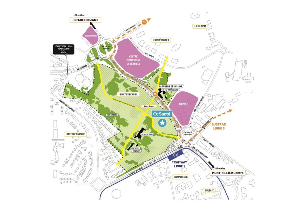 Le groupe Oc Santé (issu de la Polyclinique Saint-Roch) a choisi le site de la ZAC de Gimel, situé à 9 kilomètres de l’implantation actuelle de la clinique Clémentville, en collaboration avec la mairie de Grabels, Montpellier Méditerranée Métropole et le groupe GGL, aménageur de la ZAC.