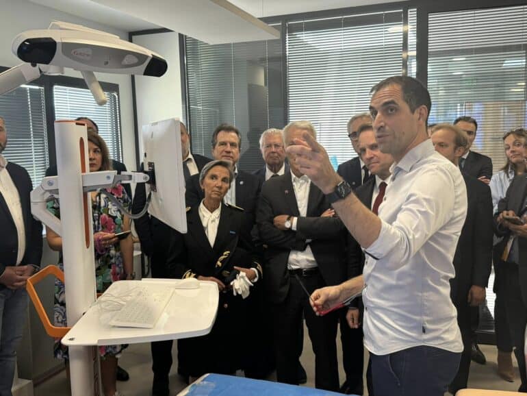 Dans l’après-midi, il s’est rendu sur le site de l’entreprise innovante Quantum Surgical, à Montpellier, accompagné de la sous-préfète, secrétaire générale de la préfecture de l’Hérault. QuantumSurgical développe le robot médical Epione, conçu pour assister les chirurgiens dans les interventions de destruction de tumeurs. Le ministre a assisté à une démonstration de cette technologie de pointe.
