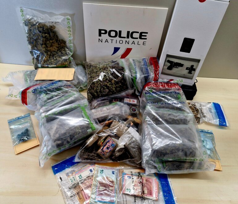 Les différentes perquisitions ont permis la saisie de quantités significatives de stupéfiants. Dans le véhicule du livreur, les policiers ont découvert 18 grammes de résine de cannabis, 5. grammes d’herbe ainsi que 500 euros en espèces. Au domicile du couple, les forces de l’ordre ont mis la main sur un peu plus de 3 kg d’herbe, près de 3 kg de résine et 1280 euros en liquide. La valeur marchande de l’ensemble est estimée à environ 55 000 euros à la revente. Lors des investigations, une arme à gaz ainsi que des munitions de différents calibres ont également été retrouvées au domicile du couple. Par ailleurs, de nombreux produits contrefaits de marques de luxe françaises y ont été découverts. L’homme a reconnu les avoir acquis.