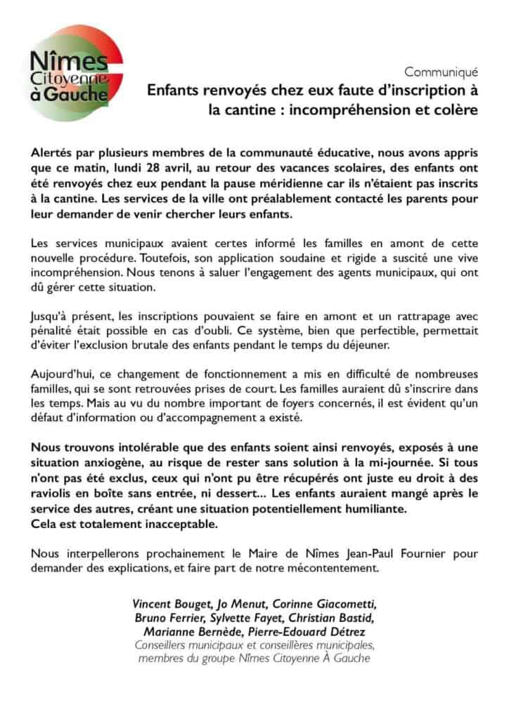 Dans un communiqué, les élus du groupe Nîmes Citoyenne à Gauche dénoncent une décision « intolérable ». Selon eux, certains enfants ont été contraints de manger des boîtes de raviolis, sans entrée ni dessert, après leurs camarades. Ils parlent d’un traitement « potentiellement humiliant ». Ils demandent des explications au maire de Nîmes, Jean-Paul Fournier.