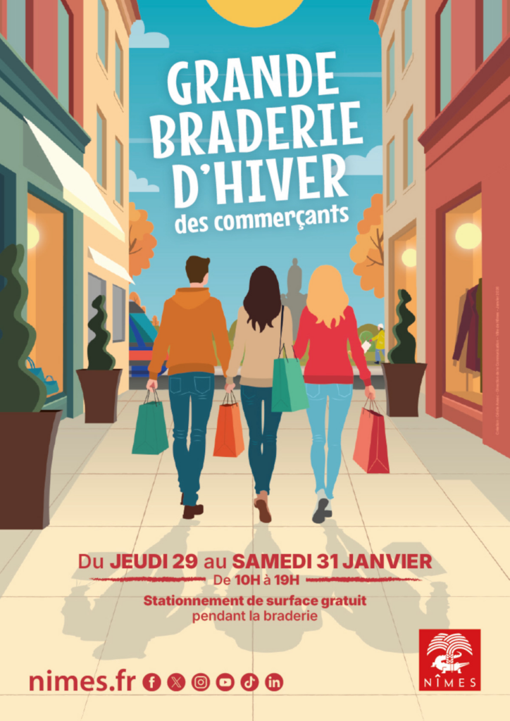 La braderie d’hiver des commerçants de Nîmes réserve de belles surprises et de bonnes affaires. Plus de 1000 commerces vous attendent dans le centre-ville de Nîmes et le stationnement de surface est gratuit pour l’occasion, du jeudi 29 janvier au samedi 31 janvier inclus. En rouge dans votre agenda : du jeudi 29 au samedi 31 janvier 2026 de 10h à 19h.
