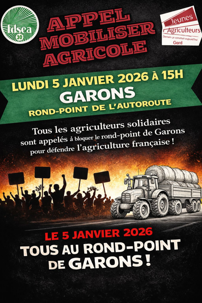 La FDSEA et les Jeunes agriculteurs du Gard n’entendent pas baisser les bras. En protestation contre l’accord de libre échange Mercosur, les agriculteurs prévoient de bloquer le rond-point de l’autoroute A54, à Garons, ce lundi à 15h, dans le cadre de « l’Opération détermination absolue ». Le message a été relayé sur les réseaux sociaux au moyen d’une affiche que voici :