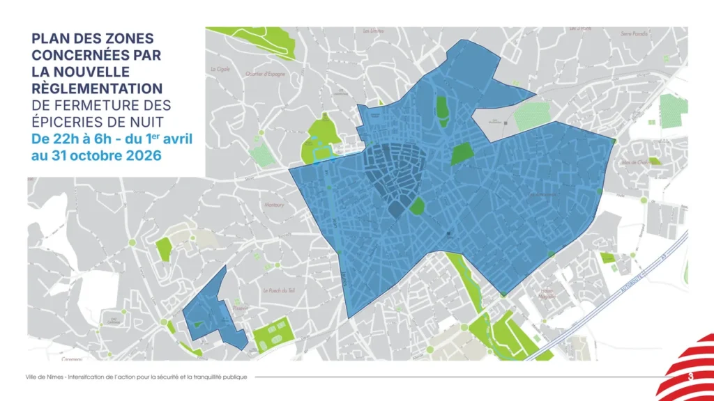 Cette mesure, prise à l’approche de la saison estivale, intervient afin de réduire les nuisances et incidents sur la voie publique, tels que des attroupements nocturnes, des troubles de voisinage, des ivresses publiques, des rixes, des dégradations de l’espace public ainsi que des dépôts de déchets. Des situations « fréquemment liées à l’activité nocturne de certains établissements de vente d’aliments et de boissons à emporter, en particulier les épiceries de nuit, ainsi qu’à une consommation excessive d’alcool sur la voie publique, en dépit de la réglementation en vigueur », explique la Ville de Nîmes dans un communiqué.