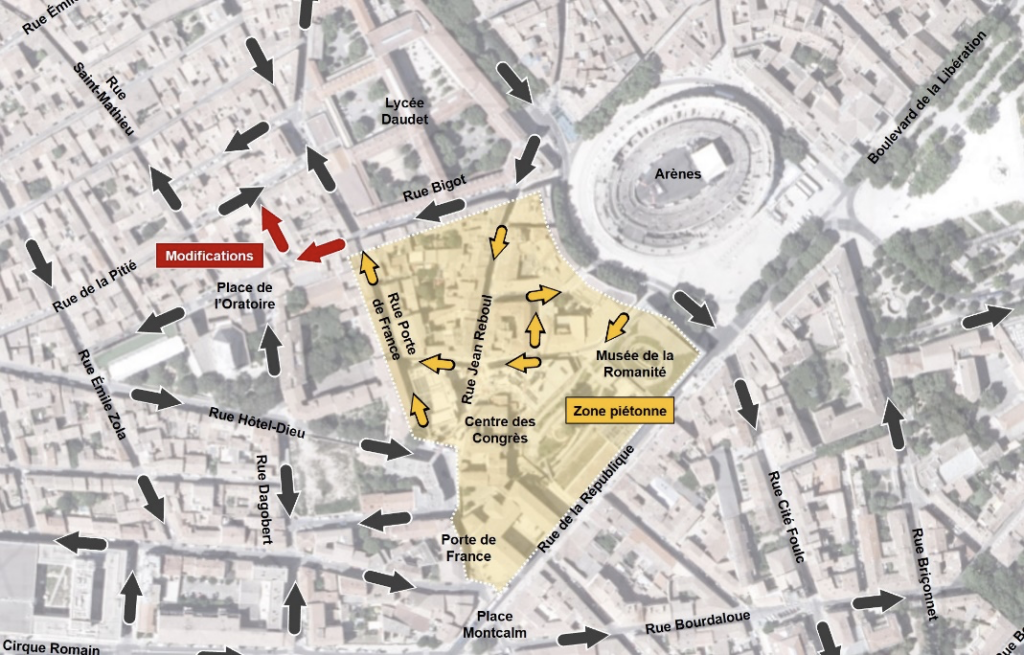 « Afin de garantir une meilleure fluidité du trafic et de permettre les girations des véhicules », le sens de circulation de la rue Bigot sera inversé entre la rue Porte de France et la place de l’Oratoire. Cette modification entraîne l’inversion consécutive du sens de circulation de la rue Traucat, les girations étant impossibles dans le sens actuel. Les changements de circulation sont matérialisés en rouge sur le plan en fin d’article.