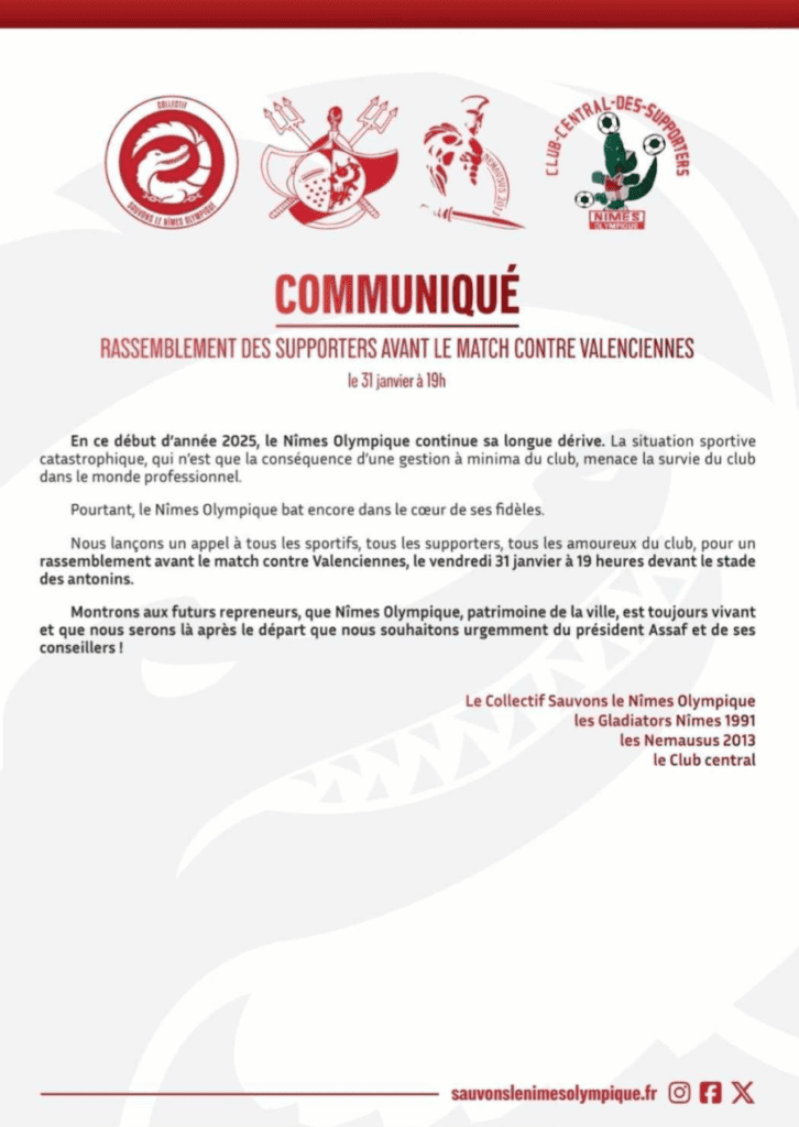 L’appel au rassemblement est prévu pour vendredi 31 janvier à 19h, devant le stade des Antonins. Dans un communiqué conjoint (voir ci-dessous), le Collectif Sauvons le Nîmes Olympique, les Gladiators, les Nemausus 2013 et le Club central des supporters dénoncent la « longue dérive » du club au regard des derniers résultats sportifs et d’une performance jugée « catastrophique ». Battus 3-2 à Châteauroux vendredi, le Nîmes Olympique est 16e du championnat National, en position de relégation.
