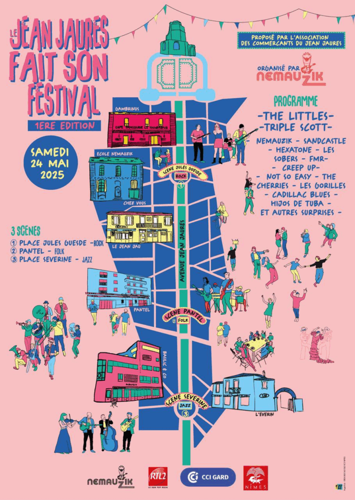 Nouveau ! Un premier festival de musique se déroulera à 14h, le 24 mai prochain sur l’avenue Jean Jaurès à Nîmes. Un évènement qui se veut être un tremplin pour de jeunes groupes avec une montée en puissance au fil de la journée et la présence des groupes professionnels. La restauration sera assurée par les professionnels de l’avenue. Cet événement festif proposé par l’Association des commerçants de Jean Jaurès proposera 3 scènes : place Jules Guesde (rock), Pantel (folk), place Severine (Jazz).